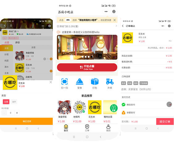 用户可通过线上微信、余额支付,线下货到付款的方式,轻松完成小程序外卖下单,不一样的下单体验